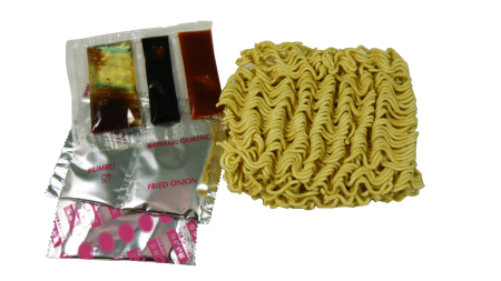 Pengemasan mi dalam pembungkus aliran horizontal dengan pendorong yang lebih lebar dan rol-film-bawah. Tipe Mesin:450IB.