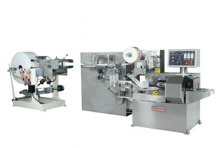 HOPAK garis kemasan otomatis untuk tisu basah dimulai dengan kertas berbaris, lipatan tisu (bentuk W), penglembaban, pemotongan, lipatan 1/2, konveyor pemberian makan ke mesin kemasan, sepenuhnya otomatis dan menghemat ruang kerja. Gaya kemasan dapat berupa kantong bantal, segel tiga sisi, atau segel empat sisi.