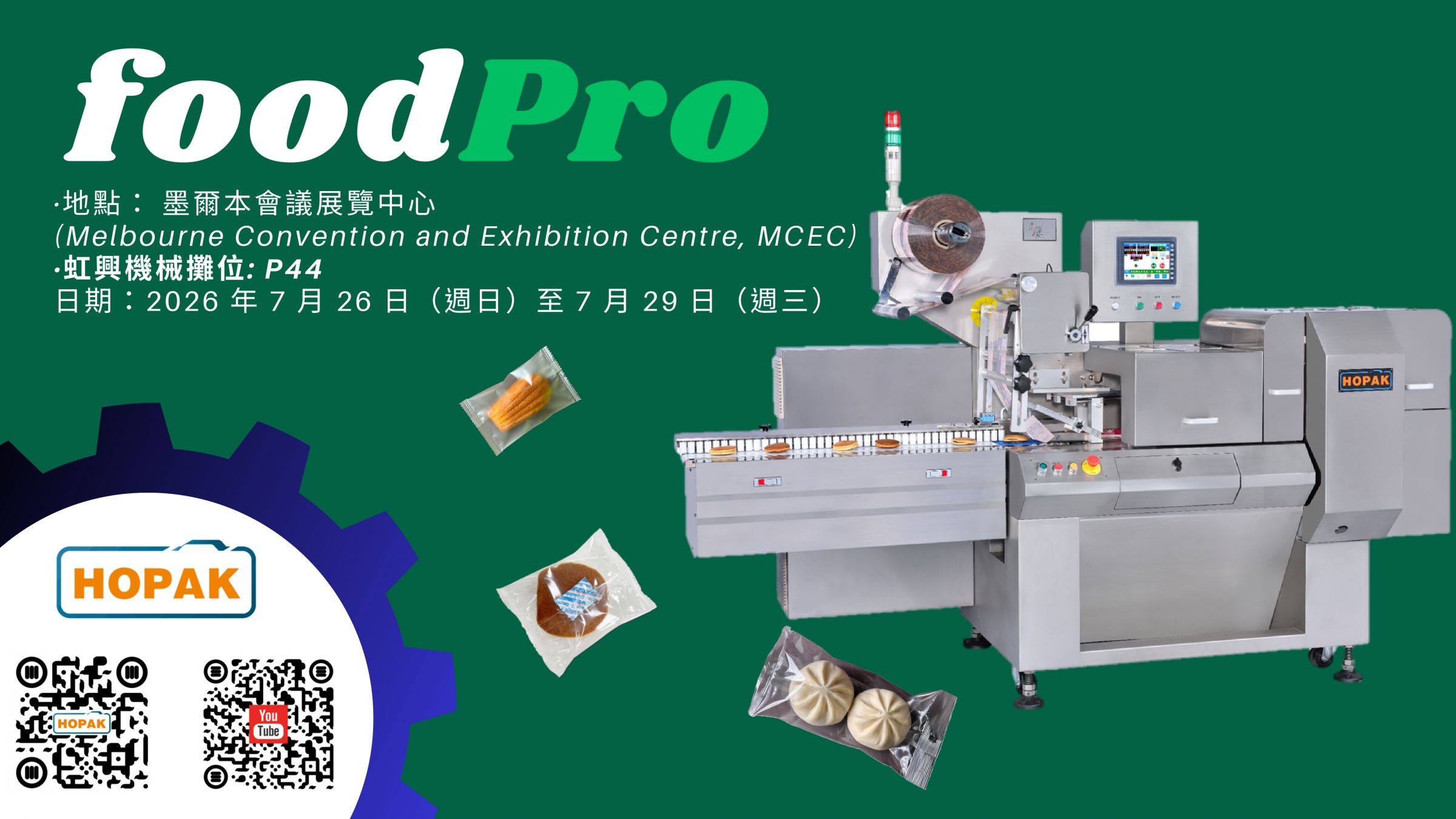 澳洲最具規模的食品加工與包裝盛會 foodpro 將於 2026/7/26-29 於墨爾本盛大舉行。HOPAK (虹興機械) 誠摯邀請您蒞臨 P44 攤位,現場將展示高效自動化包裝技術與智慧生產解決方案,助力您提升產能並優化包裝流程,期待與您開拓大洋洲商機!
